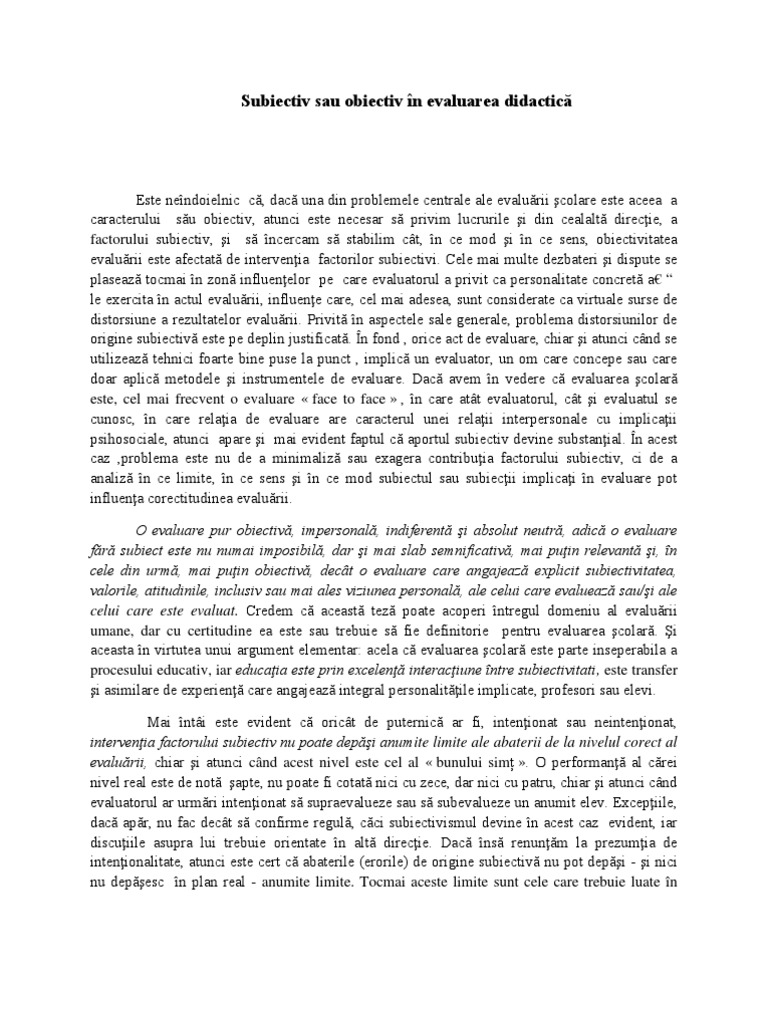 Subiectiv Sau Obiectiv In Evaluarea Didactica Eseu Tema De