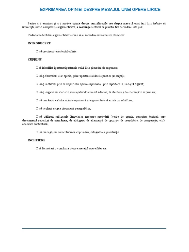 Exprimarea Opiniei Despre Mesajul Unei Opere Lirice Pdf Document