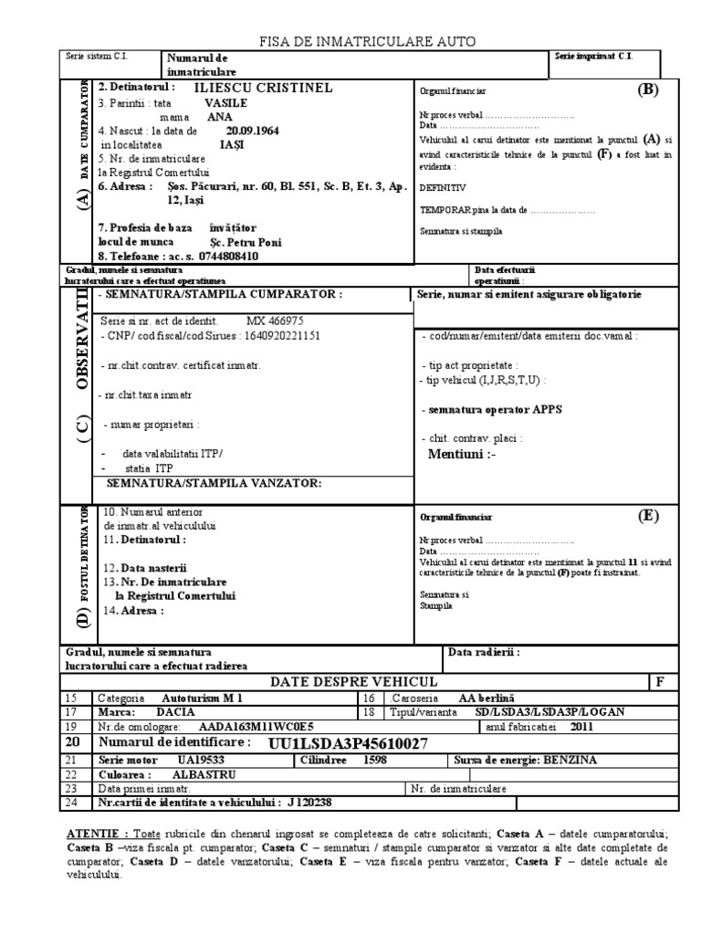 Fisa De Inmatriculare Auto