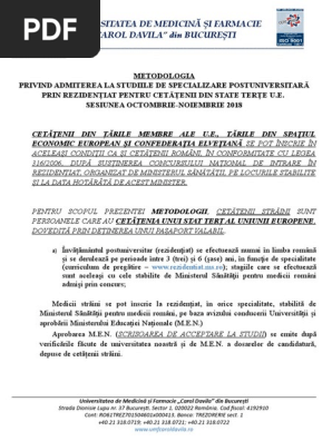 Concursul național de intrare în rezidențiat se amână pentru data de 8 decembrie 2019. Repartiția pe clinici de îndrumare centrul universitar bucurești repartiția pe clinici de îndrumare metodologică și stagii de pregătire a medicilor confirmați în rezidentiat în domeniile medicină medicină dentară și farmacie sesiunea 18 noiembrie 2018 care au ales pentru pregătire centrul universitar bucurești va avea loc în zilele de 17 18 19 și 20 decembrie. Sesizarea de către candidați a eventualelor erori de redactare se va face până cel târziu 29 noiembrie 2019 iar în 5 decembrie se va afișa pe site ul rezidentiat ms ro și pe site urile facultăților de medicină și farmacie repartizarea candidaților pe săli în funcție de domeniul pentru care s au înscris. Decizia ministerului sănătății vine după ce în prealabil a fost mărit şi numărul de locuri pentru concursul de rezidențiat 2018.