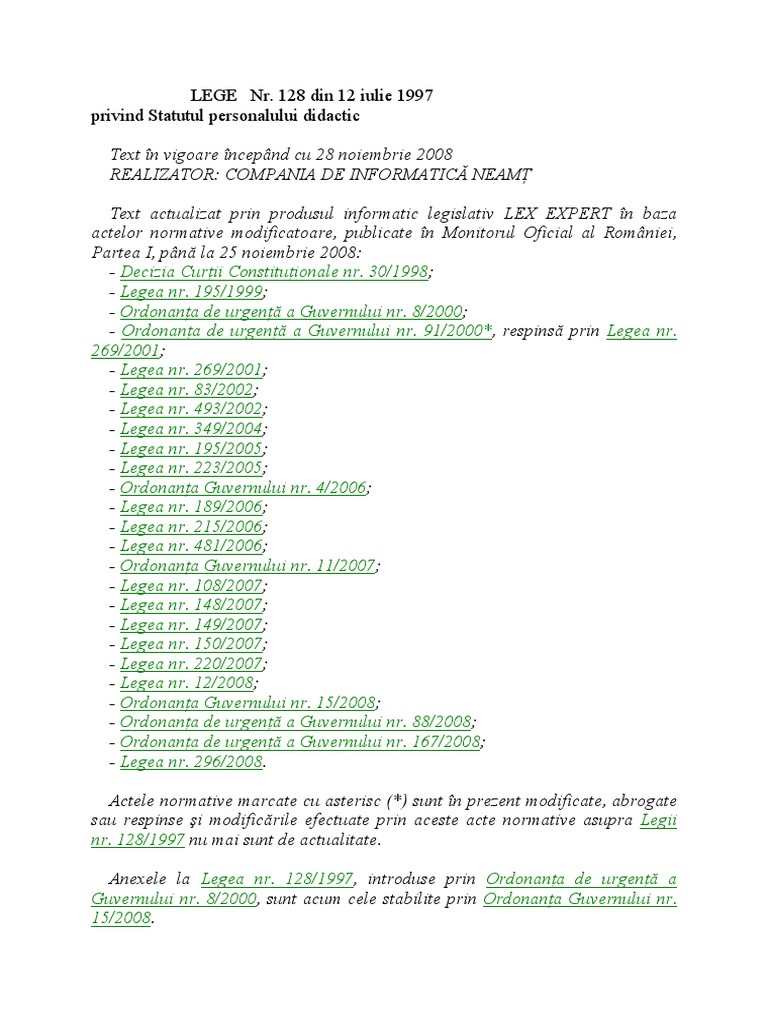 Legea Nr 128 Din 1997 Privind Statutul Personalului Didactic Cu